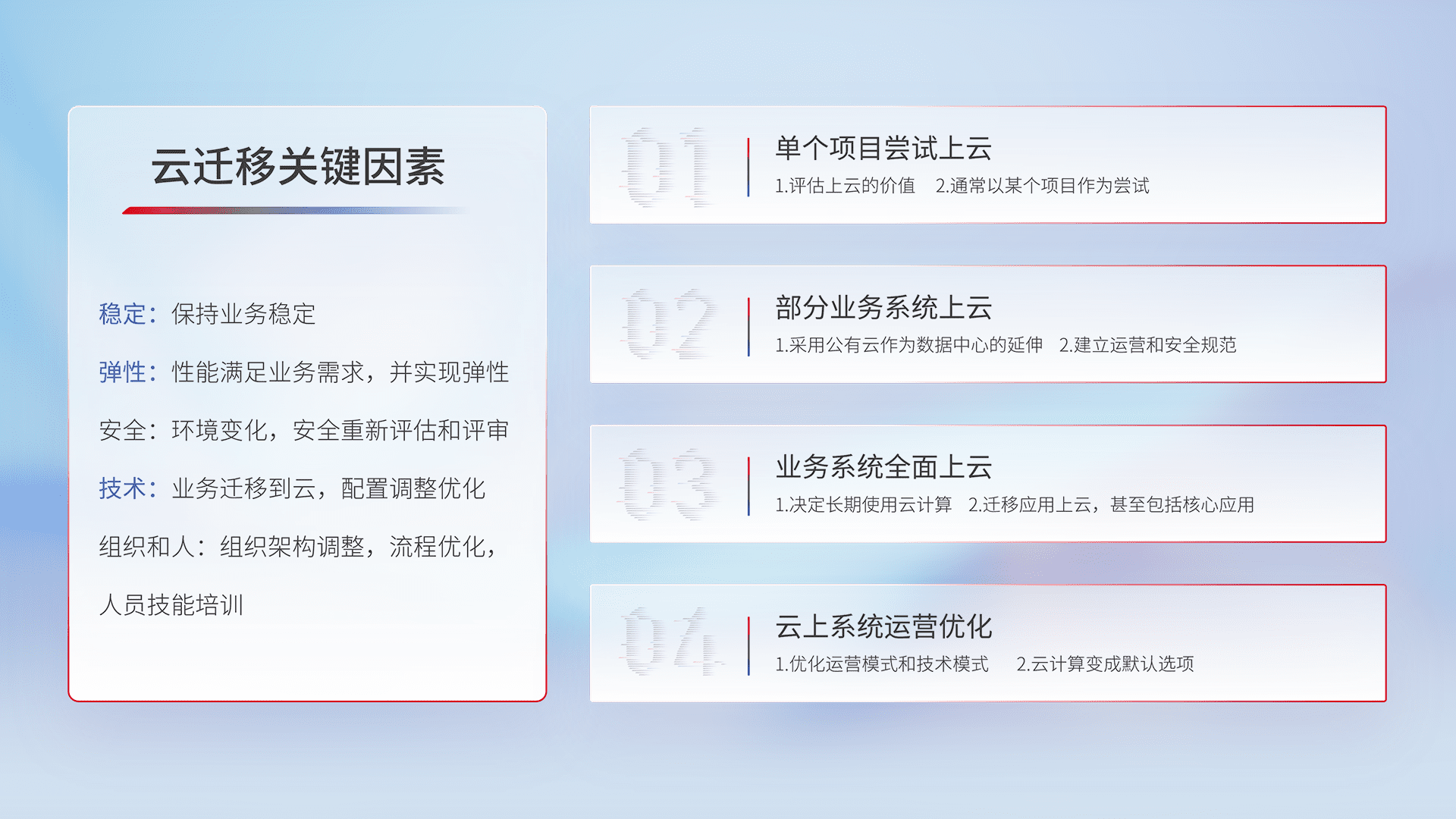 结合实际业务,,,从规划设计、、、、云平台选型、、云原生改造、、、、数据迁移、、、集成交付,,,迁移全过程为客户识别最佳上云路径,,做好风险识别管理,,,,设计网络架构、、、身份权限、、、安全审计合规、、、、操作审计、、、日志审计、、监控告警策略、、、、多站点容灾设计等,,对云上基础设施进行整体规划,,,,提升IT治理水平,,以满足弹性、、、、高可用、、、、高性能的需求。。。。