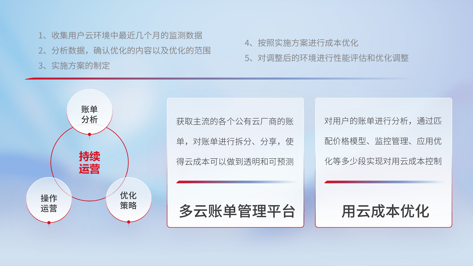 通过多云纳管,,以统一的资源数据模型把客户的云资源进行抽象和封装,,,,进而实现对多云资源的统一操作,,保障云资源管理的可靠性、、、稳定性与可用性。。。。量身定制化运维内容,,,配置、、开发运维、、、、补丁管理、、、备份、、监控、、、认证和访问管理、、、、审计和日常巡检等,,,保障在用云过程中的可靠度,,稳定度以及高可用率。。。。